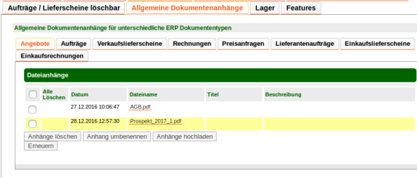Unter dem Reiter Allgemeine Dokumentenanhänge kann für alle ERP-Dokumente ( Angebote, Aufträge, Lieferscheine, Rechnungen im Verkauf und Einkauf ) allgemeingültige Anhänge hochgeladen werden.