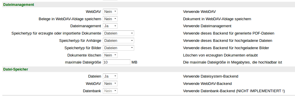 Unter dem Reiter Features im Abschnitt Dateimanagement ist neben dem "alten" WebDAV das Dateimangement generell zu- und abschaltbar, sowie die Zuordnung der Dateitypen zu Backends. Die Löschbarkeit von Dateien, sowie die maximale Uploadgröße sind Backend-unabhängig
