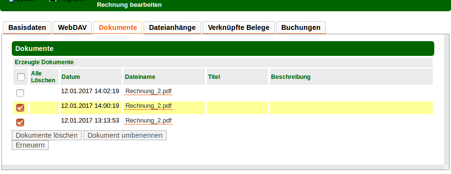 Die Daten werden bei den ERP-Objekten als extra Reiter dargestellt. Eine Verkaufsrechnung z.B. hat die Reiter "Dokumente" und "Dateianhänge".